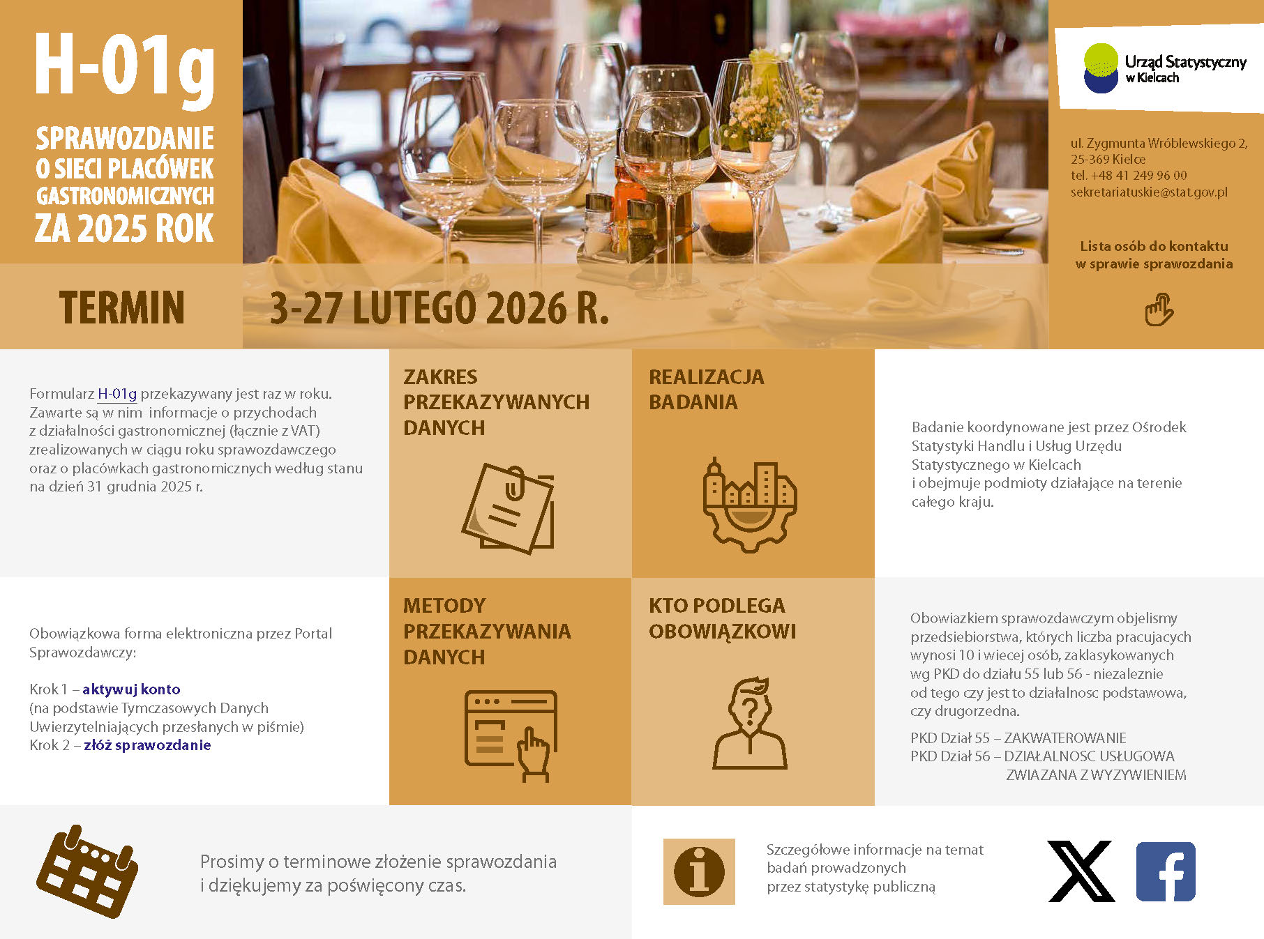 H-01g Sprawozdanie o sieci placówek gastronomicznych za 2025 r. – termin udostępnienia formularza elektronicznego 3 -27 lutego 2026 r.