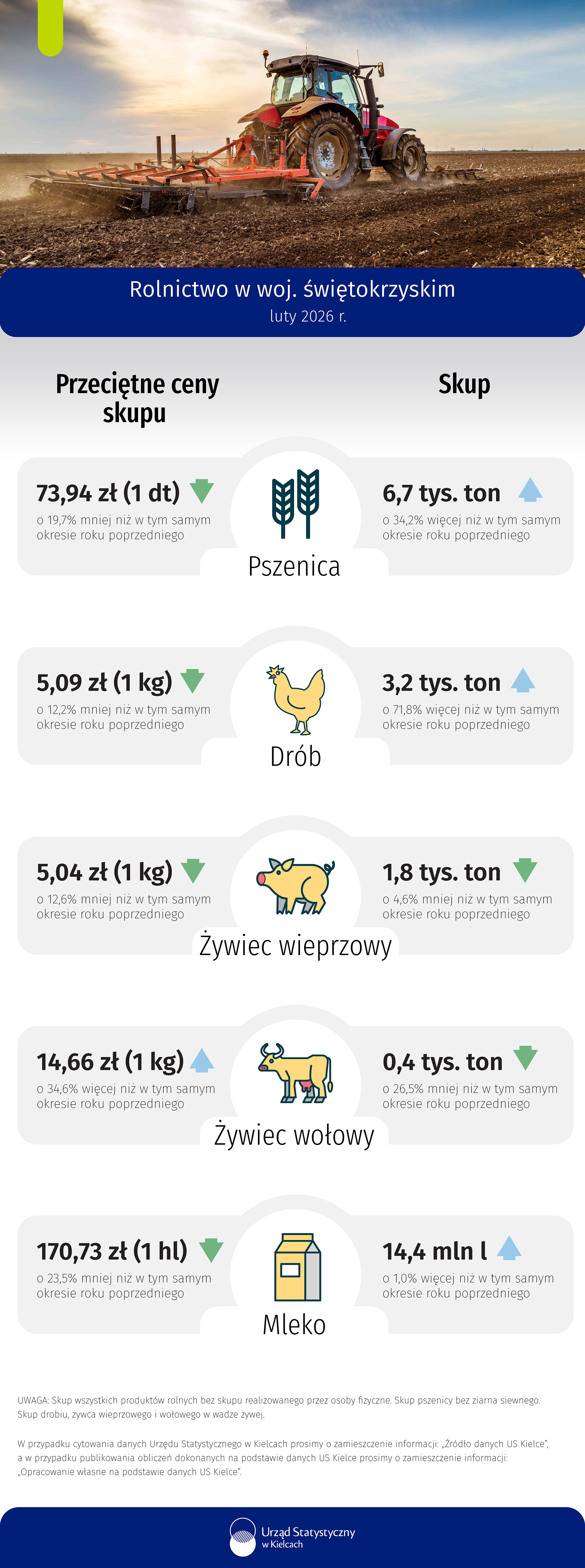 Rolnictwo w województwie świętokrzyskim - luty 2026 r. - infografika A A A 27.03.2026 Pliki do pobrania Rolnictwo w województwie świętokrzyskim - luty 2026 r. - infografika 0.69 MB Rolnictwo w województwie świętokrzyskim - luty 2026 r. - dane do infografiki 0.01 MB Rolnictwo w województwie świętokrzyskim - luty 2026 r. - tablice dla osób z dysfunkcją wzroku 0.02 MB