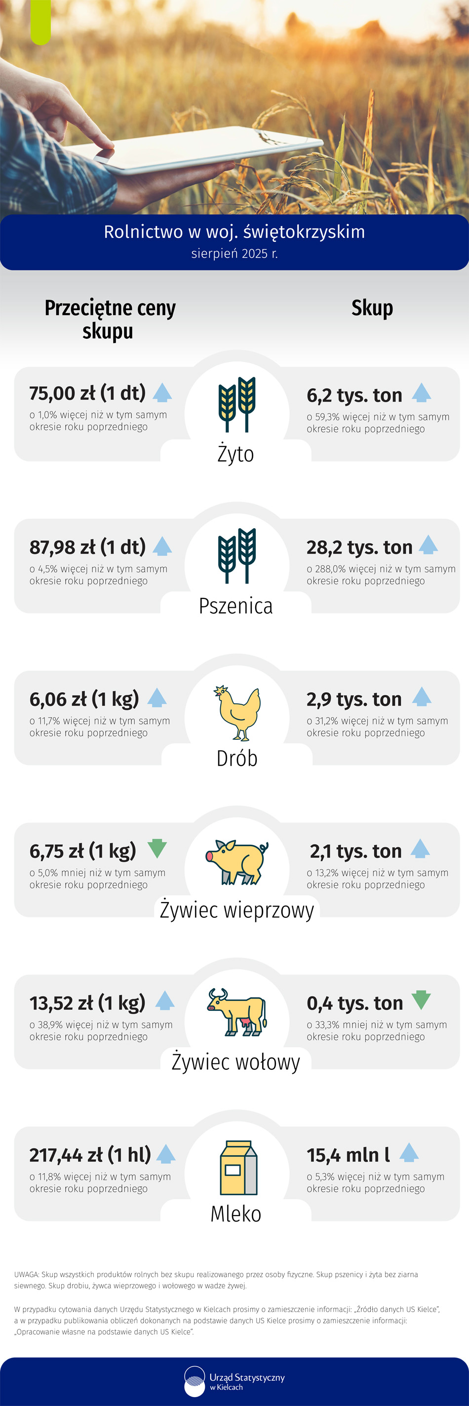 Rolnictwo w województwie świętokrzyskim - sierpień 2025 r. A A A 29.09.2025 Pliki do pobrania Rolnictwo w województwie świętokrzyskim - sierpień 2025 r. 0.89 MB Rolnictwo w województwie świętokrzyskim – sierpień 2025 r. – dane do infografiki 0.01 MB Rolnictwo w województwie świętokrzyskim – sierpień 2025 r. – tablice dla osób z dysfunkcją wzroku 0.02 MB
