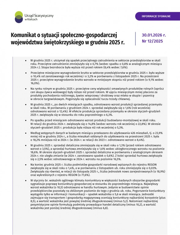 Komunikat o sytuacji społeczno-gospodarczej województwa świętokrzyskiego - grudzień 2025