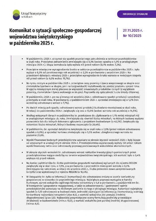 Komunikat o sytuacji społeczno-gospodarczej województwa świętokrzyskiego - październik 2025